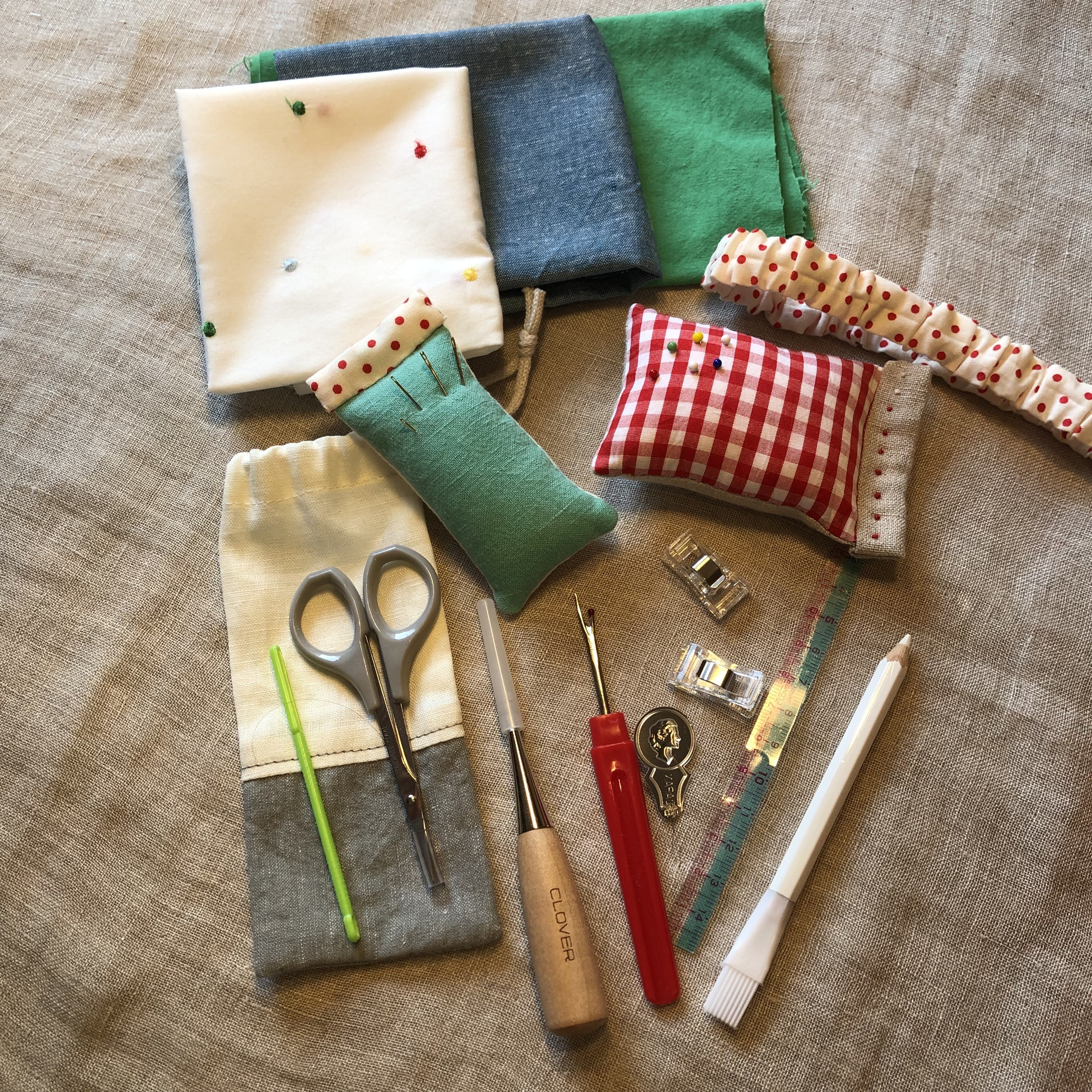 上記の道具と手作りピンクッションやリッパーなどを収納する巾着の他